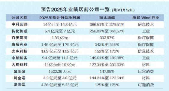 据上海证券报记者统计,在已披露2025年业绩预告的上市公司中,约20家公司净利润同比增幅超过100%。截至1月12日,净利润增幅居前的公司分别是中科蓝讯、传化智联、百奥赛图、康辰药业。
