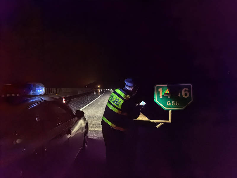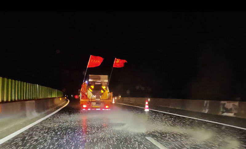 保畅即责任,严寒坚守护畅通。为保障G56杭瑞高速主动脉通行安全,六大队精准制定“压道护航、预防撒布”作业方案。20日凌晨2时至5时,2名执法队员带队,协同2名设备操作员、2名调度监督员,驾驶执法车全程压道警戒,养护部门同步出动融雪撒布机,对重点路段开展预防性融雪剂撒布作业。执法人员顶着刺骨寒风,以低于40公里的时速引导作业车队,实时监控作业进度与后方路况,确保此次高风险夜间作业安全高效完成,累计消耗融雪剂31吨。