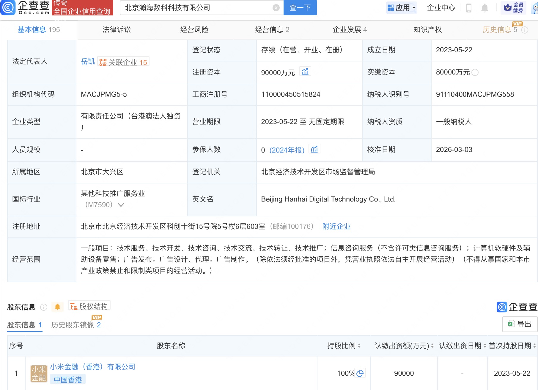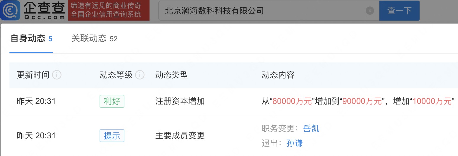 近日,北京瀚海数科科技有限公司发生工商变更,注册资本由8亿人民币增至9亿人民币。企查查信息显示,该公司成立于2023年,法定代表人为岳凯,经营范围包括信息咨询服务、计算机软硬件及辅助设备零售、广告发布等,由小米金融(香港)有限公司全资持股。