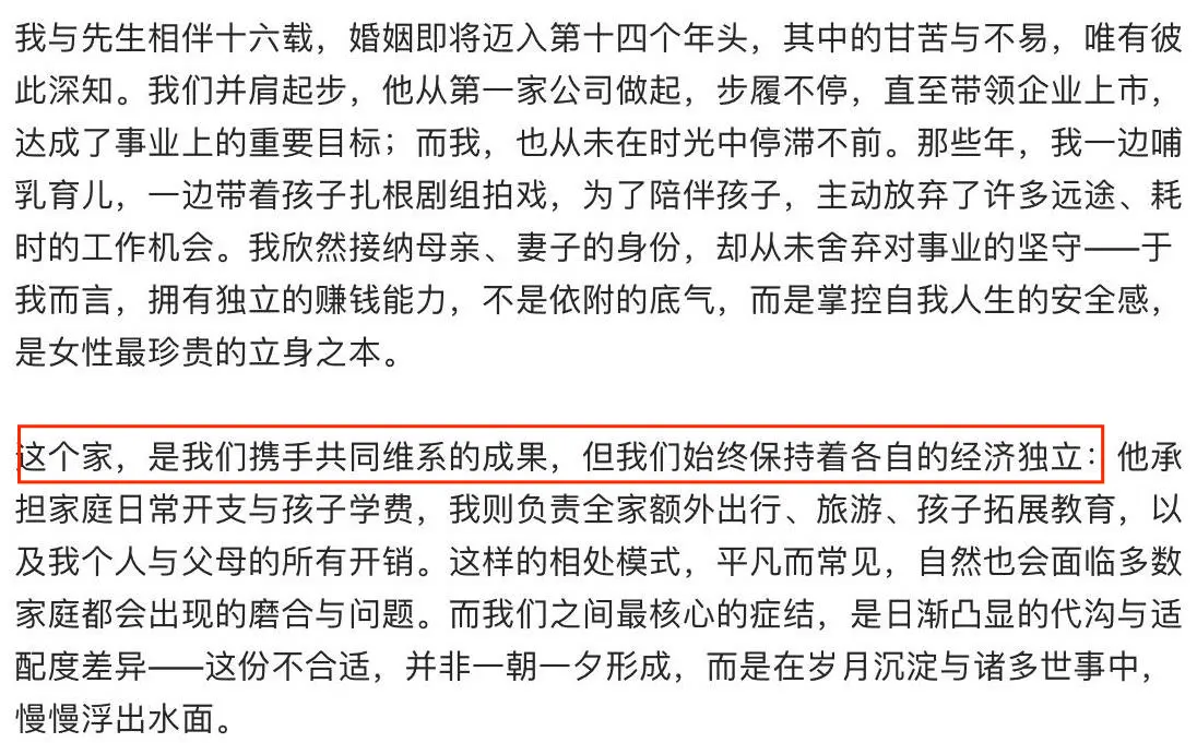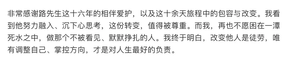 直到节目收官,她才用一篇千字长文,回应了所有争议,也官宣了离婚的决定。